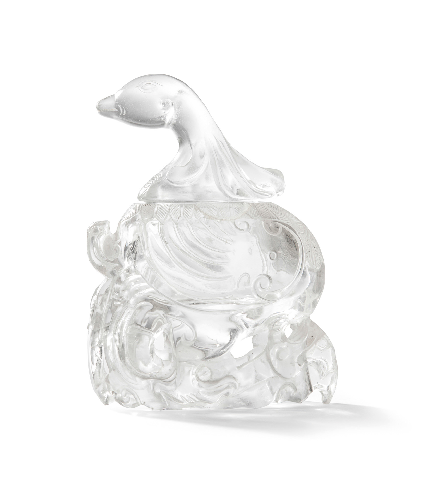 the cover carved as a duck's head, the box carved as its body on a pierced stylised rock work base