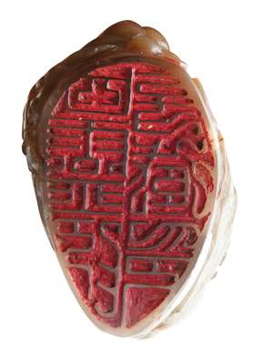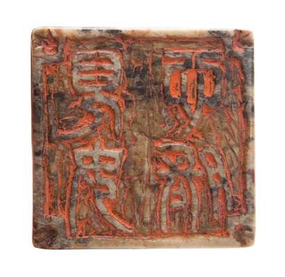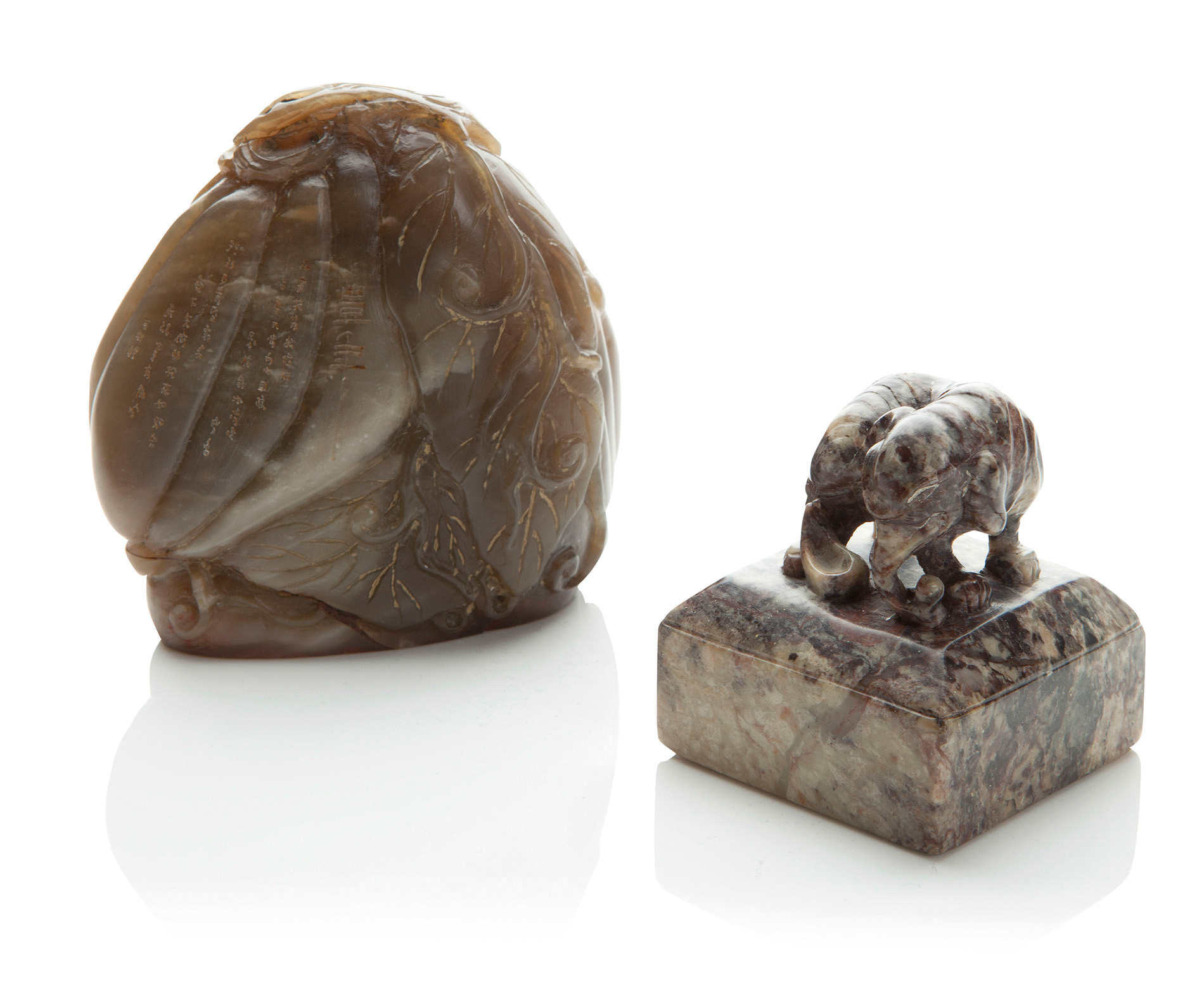 one a soapstone 'fish brain jelly' melon fruit boulder, with a micro-inscription of a poem; the other soapstone carved with an elephant (2)