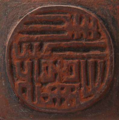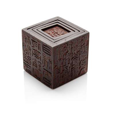 of cubic form, comprising four open-end cubes and a small solid cube, all sides inscribed with seals
