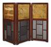 each panel with a black and gold silk fabric over open trellis panels, in a wide moulded frame