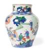 of ovoid form, the sides decorated with warriors and officials within a fenced garden amongst rockwork and plants, underglaze blue six character mark