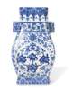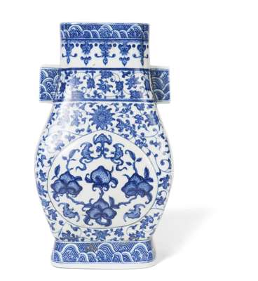 in the Ming style of squared baluster form with reserve panels decorated with peaches and bats against a ground filled with scrolling foliage and lotus blossoms, with bands of waves, underglaze blue Qianlong seal mark, but later