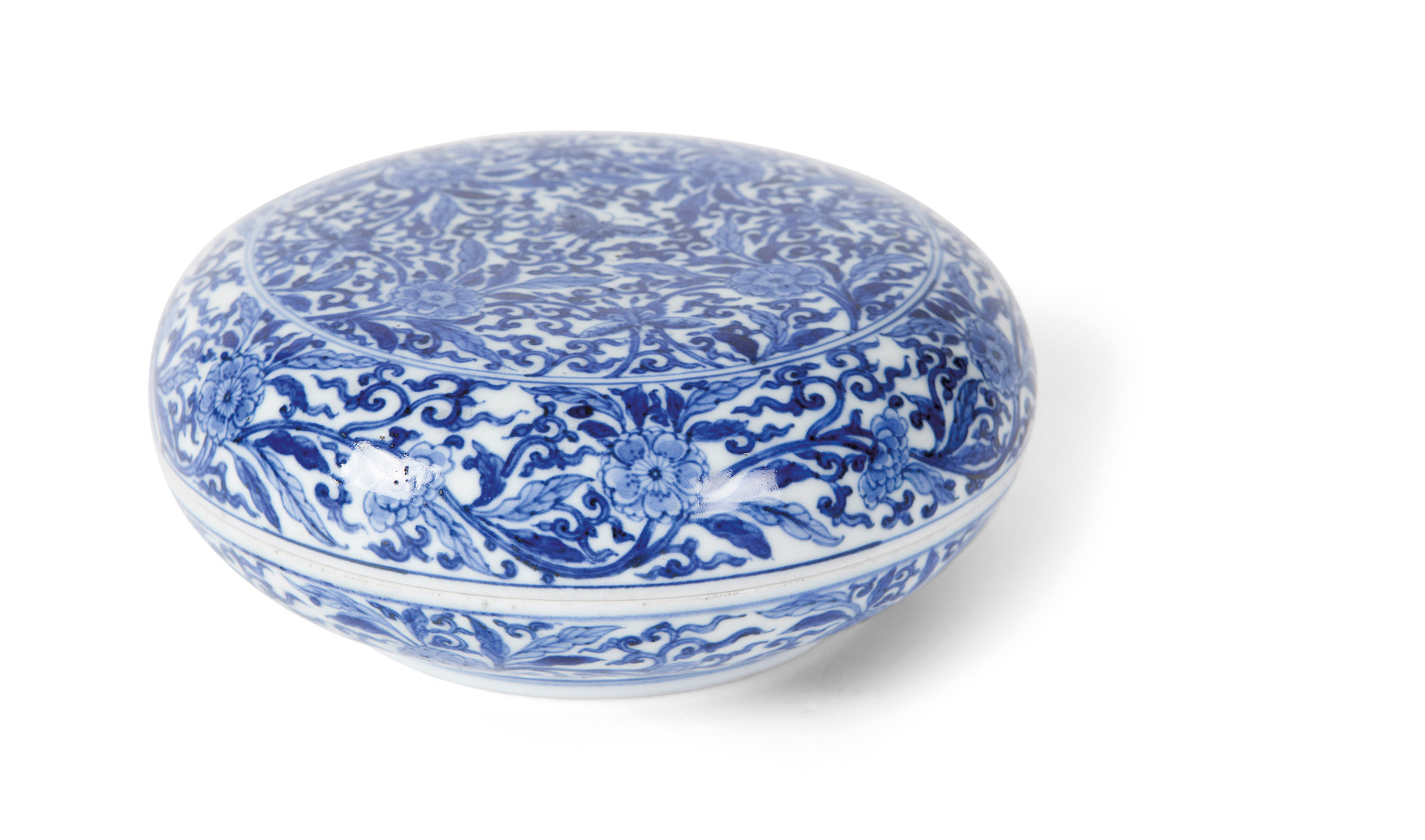 the circular box painted throughout with lotus blossom and butterflies, blue six character mark