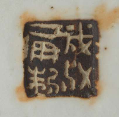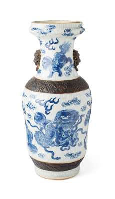 of baluster form, decorated with lions amongst clouds and fire against a crackle glaze body, the neck applied with brown glazed lion mask loop handles with further moulded brown glazed bands to the shoulder and foot, impressed seal mark to base