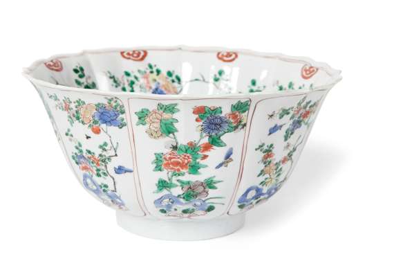 the sides decorated with reserves of birds, insects and flowers issuing from rocks, the interior with a central reserve with peony and butterfly, enclosed by tree peony and iron red ruyi heads under a foliate border, underglaze blue four character mark to the base
