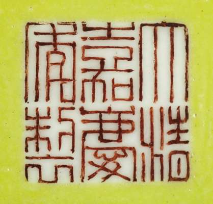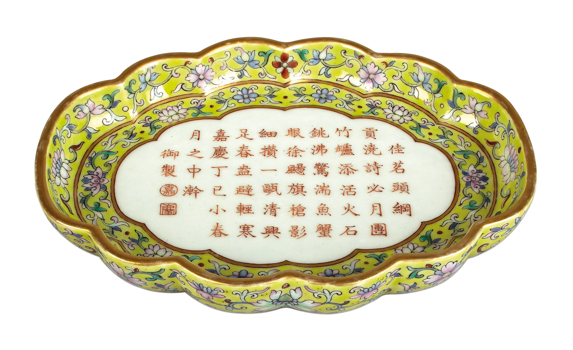 of quatrefoil form raised on four low bracket feet, painted in the centre in iron red with an Imperial poem, enclosed by scrolling sprays of lotus and other flowers in famille rose enamels within gilt borders reserved on a lime green ground, with an iron red seal mark to the base