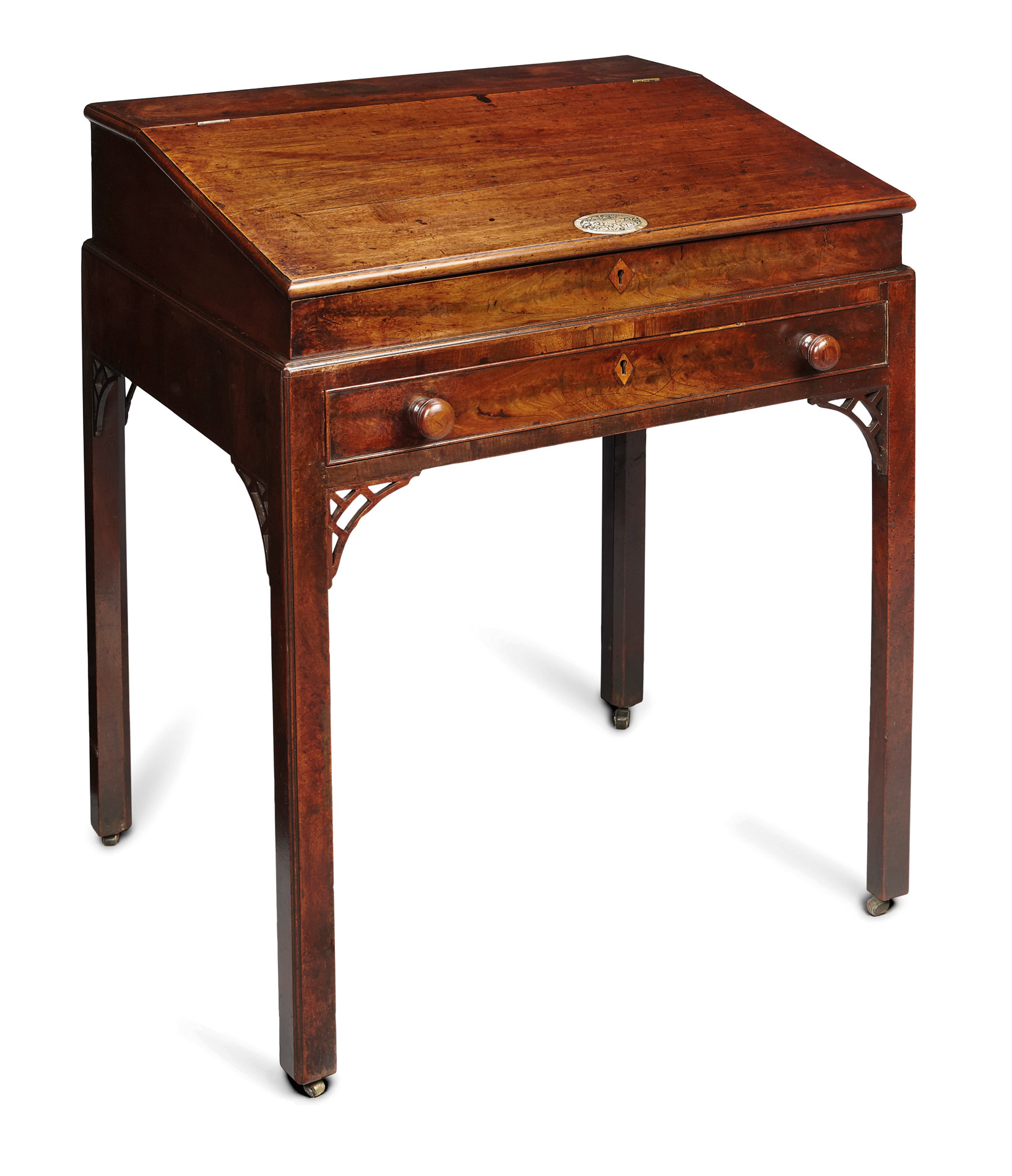 the hinged slope top mounted with a carved mother-of-pearl oval plaque carved with Chinese figures, opening to an interior fitted with drawers and pigeon holes and parquetry inlay; the stand with a long frieze drawer and raised on straight square legs with pierced corner brackets and ending on casters
