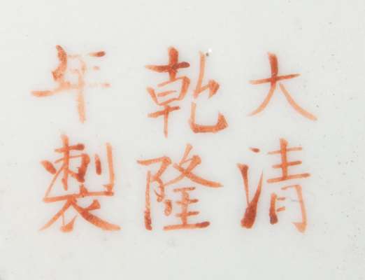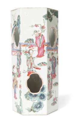 the pierced hexagonal sides painted with brightly coloured enamels with figures in a walled garden