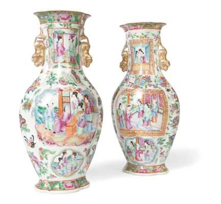 of similar baluster form with gilt animal handles, decorated with palace scenes, on a ground of butterflies, flowers and other auspicious objects, framed by gilt floral border (2)