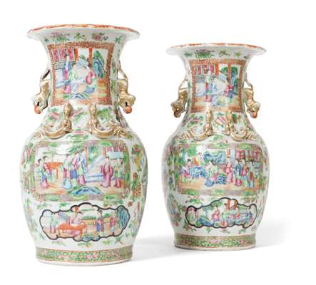 baluster form, decorated with courtiers, roses, butterflies and auspicious objects, the flared necks applied with two fu-lions, the shoulders with four chilongs (2)