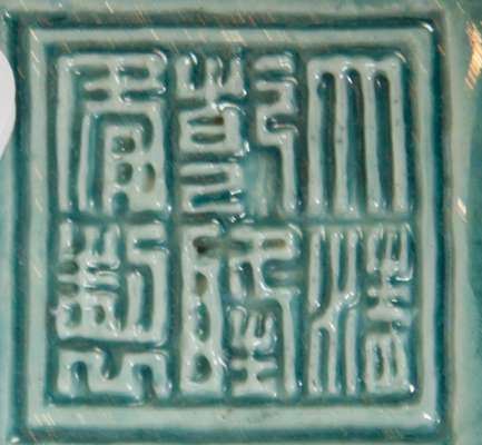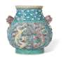 of flattened baluster form, with two relief moulded and applied reserves depicting yellow and purple dragons chasing a flaming pearl against a diaper ground with applied auspicious objects, with moulded fu dog mask lug handles fitted with loose moving eyes and tongues, moulded Qianlong seal mark but later