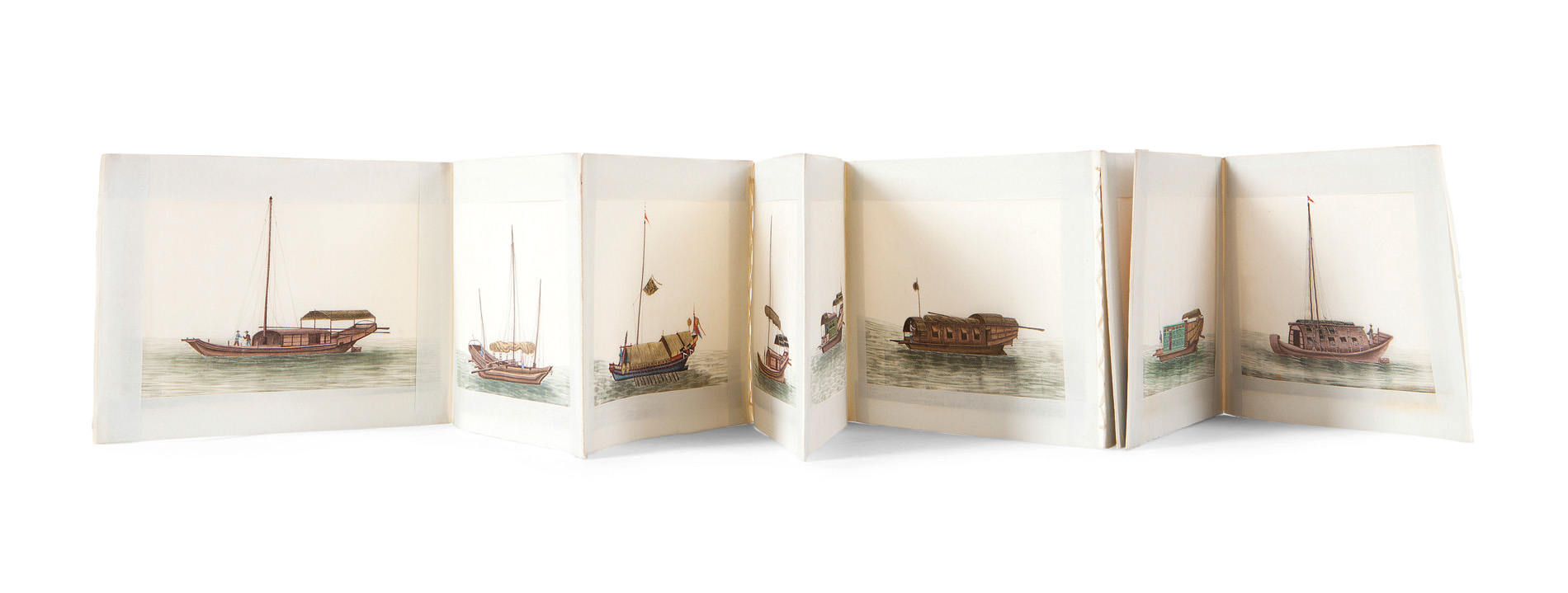 AN ALBUM OF CHINESE EXPORT PITH PAPER PAINTINGS OF JUNKS