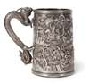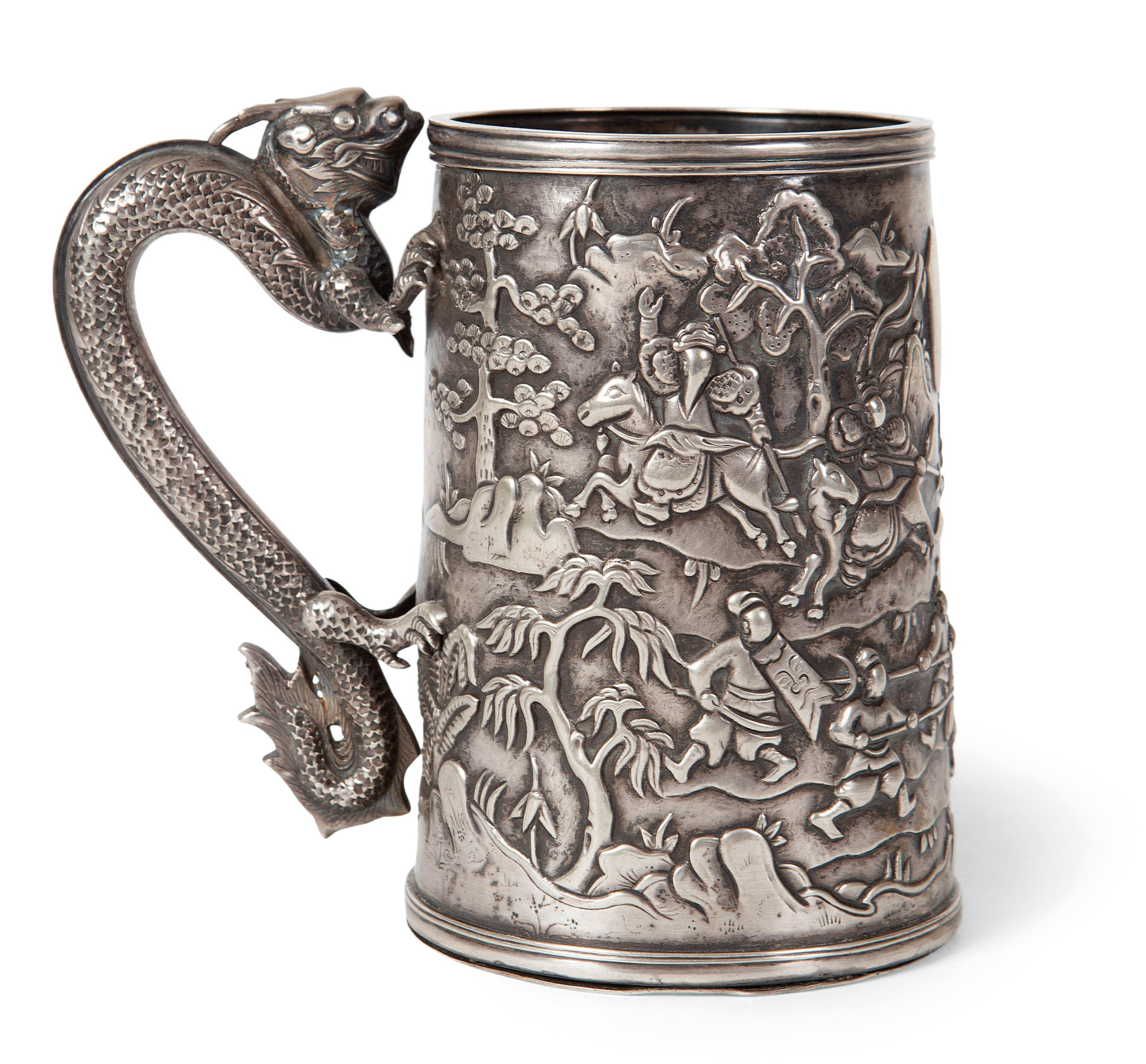 marked LEECHING to base, of flared can form with decoration of warriors in a landscape, with vacant shield cartouche and dragon formed S scroll handle