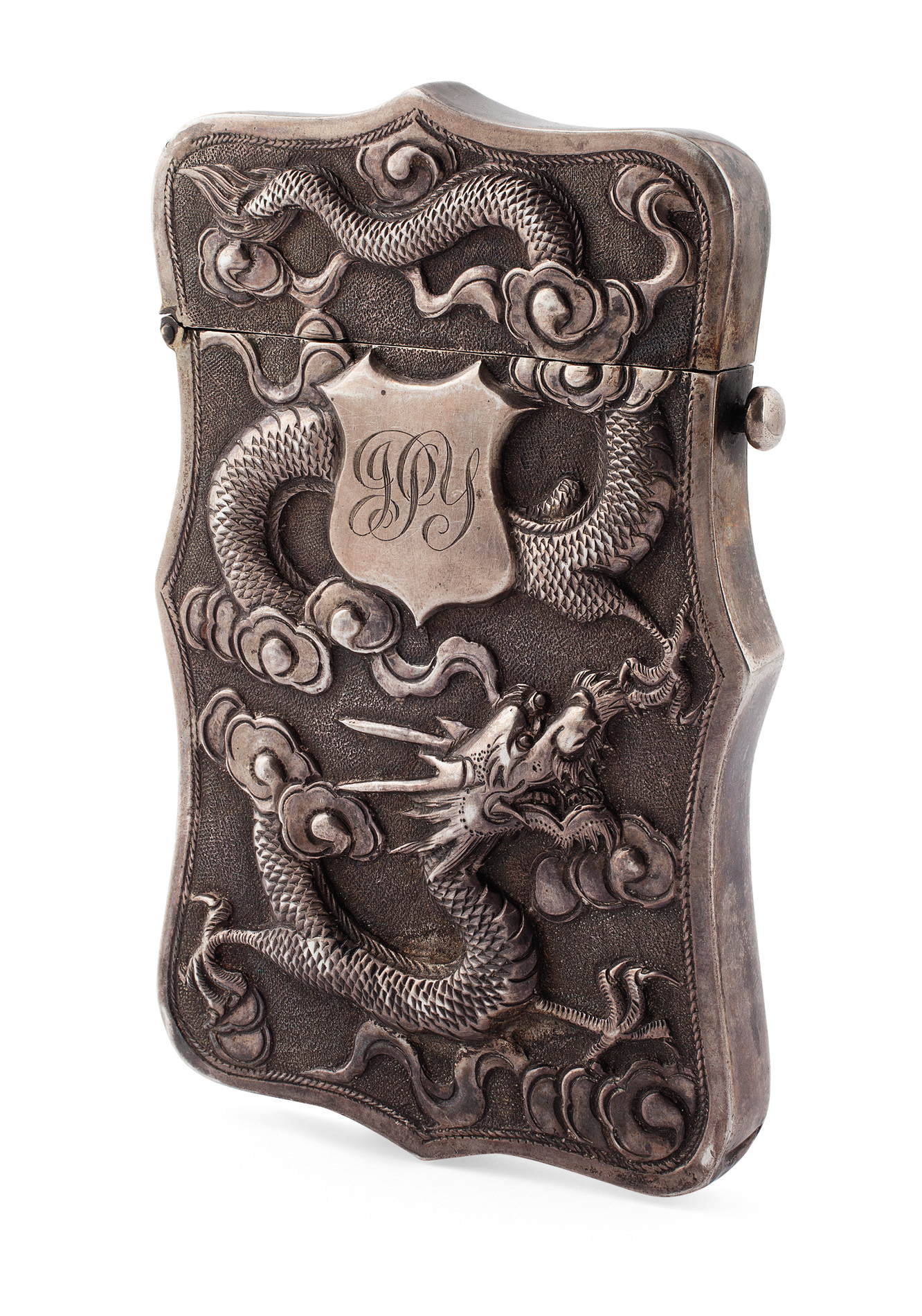 indistinctly marked to inner edge, of shaped rectangular outline with embossed dragon within clouds and shield cartouche with engraved initials to front and bamboo to reverse