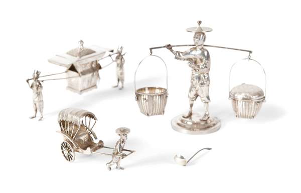 formed as a large standing figure carrying baskets, his hat lifting off to reveal a mustard pot; together with a small model of a rickshaw and another similar formed as a sedan chair with porters (3)