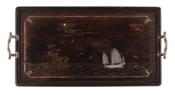 the rectangular tray with twin simulated bamboo handles and inlaid with a junk drawing upon a small island