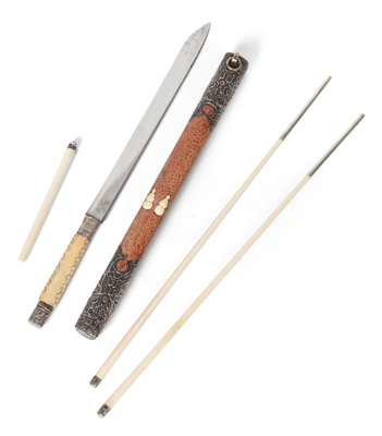 comprising a knife, a pair of chopsticks and a pick, in a red stained shagreen case with applied silver and ivory mounts