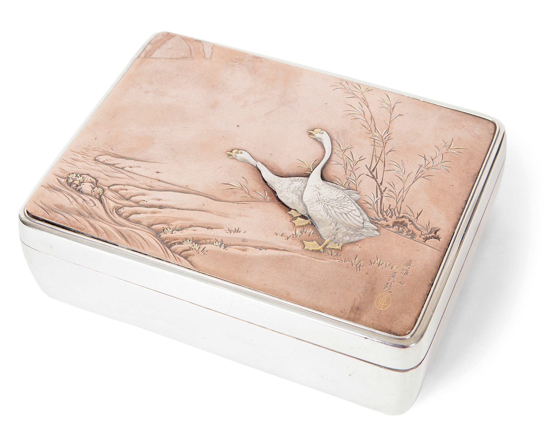 of rounded rectangular outline with plain silver raised on bracket feet, the lid with mixed metal inlay of two geese standing beside a river, with signed and inlaid twin character marks to base
