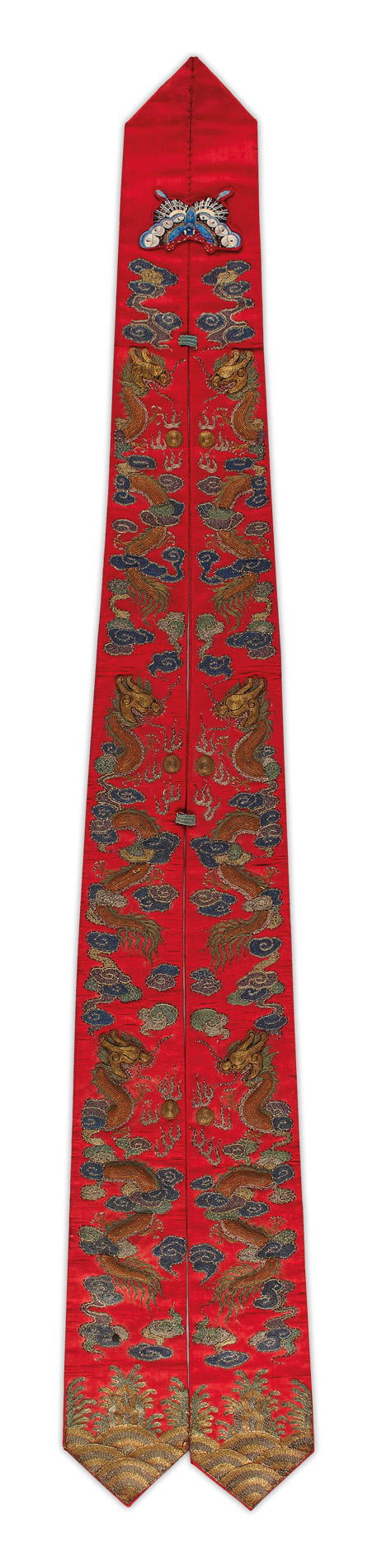 comprising a small drawstring coin purse, a handbag with bamboo handles, a rank badge and a red silk gold metallic thread embroidered hat tail (4)