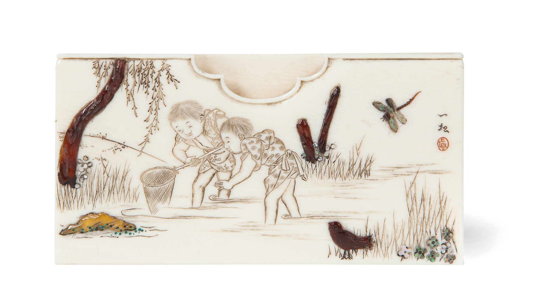 decorated with mother of pearl, tortoiseshell and abalone depicting two boys with a net in a stream, insects and a bird, signed IYSUUN, with red seal for Tokyo