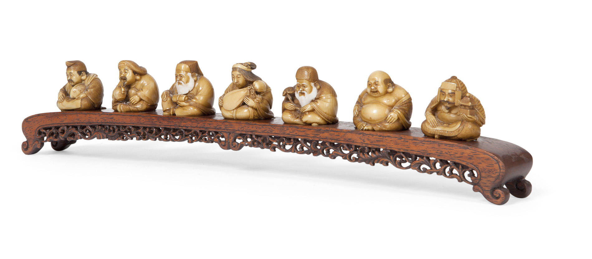 GROUP OF SEVEN STAINED IVORY NETSUKES OF IMMORTALS