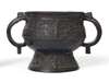 cast in the relief with stylised animal motifs and open loop animal form handles, raised on a spreading circular foot
