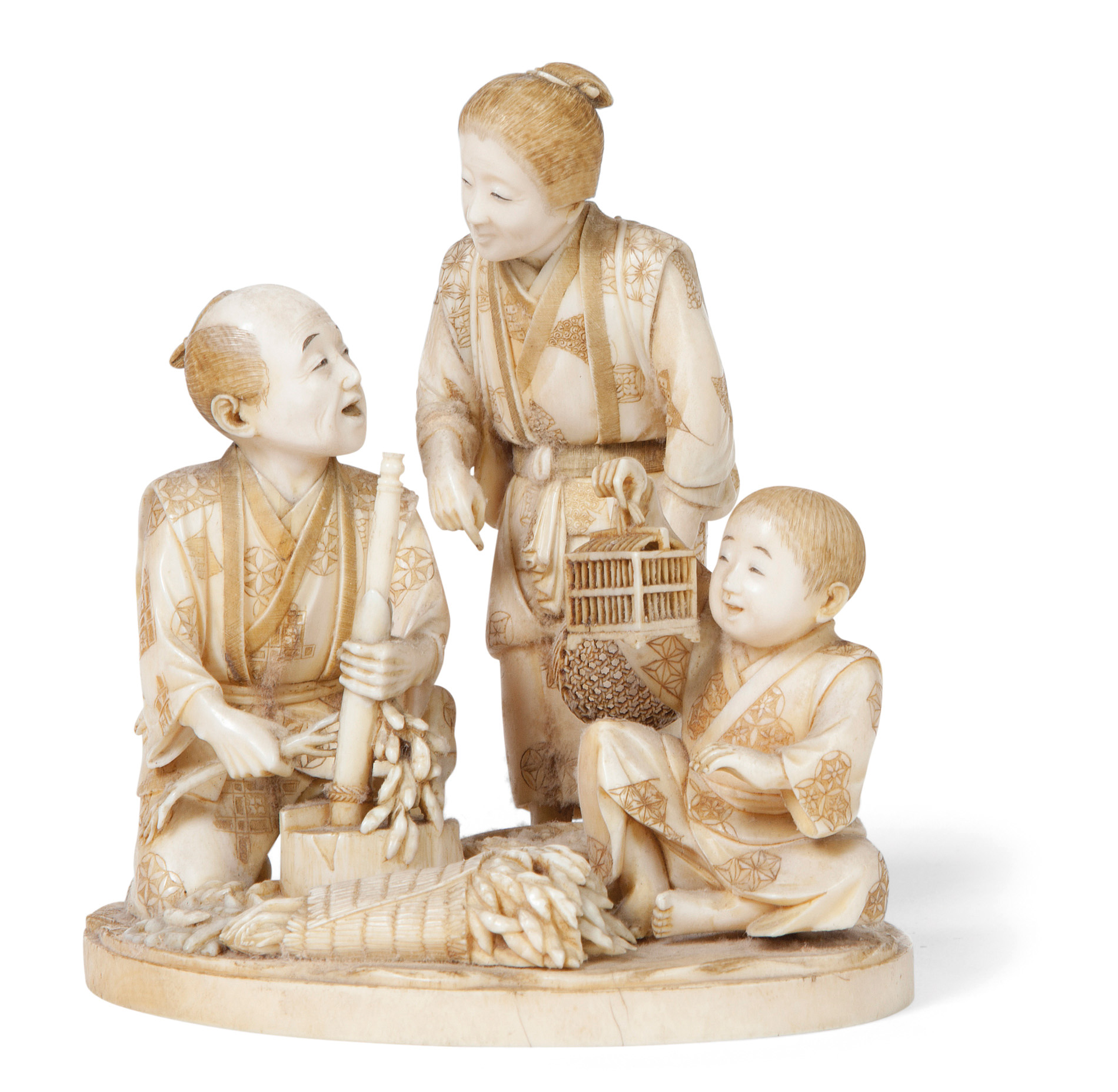 AN IVORY OKIMONO OF A FARMER AND FAMILY