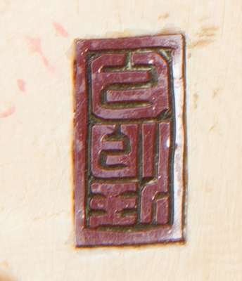 the standing figure carrying a five drawer workbox with one hand, the other holding combs and brushes, red lacquer inset signature panel to base