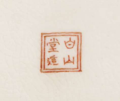 finely painted with figures within a mountainous landscape, reserved against a 'millefleurs' and geometric ground, painted seal mark