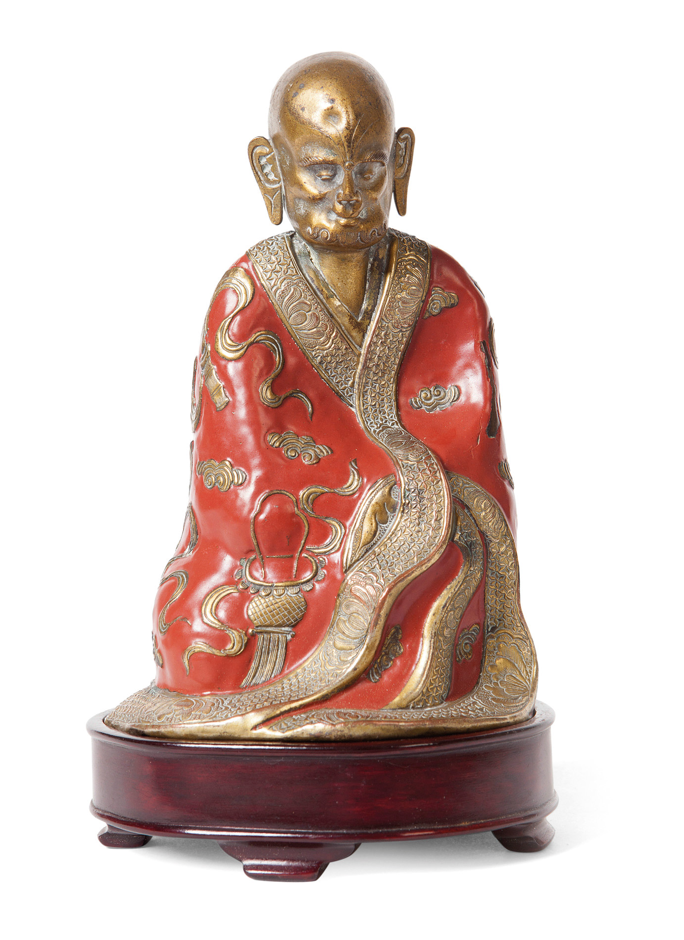 modelled seated in red enamel robes decorated with gilt metal scholar's objects, antiquities and clouds, raised on a hardwood stand