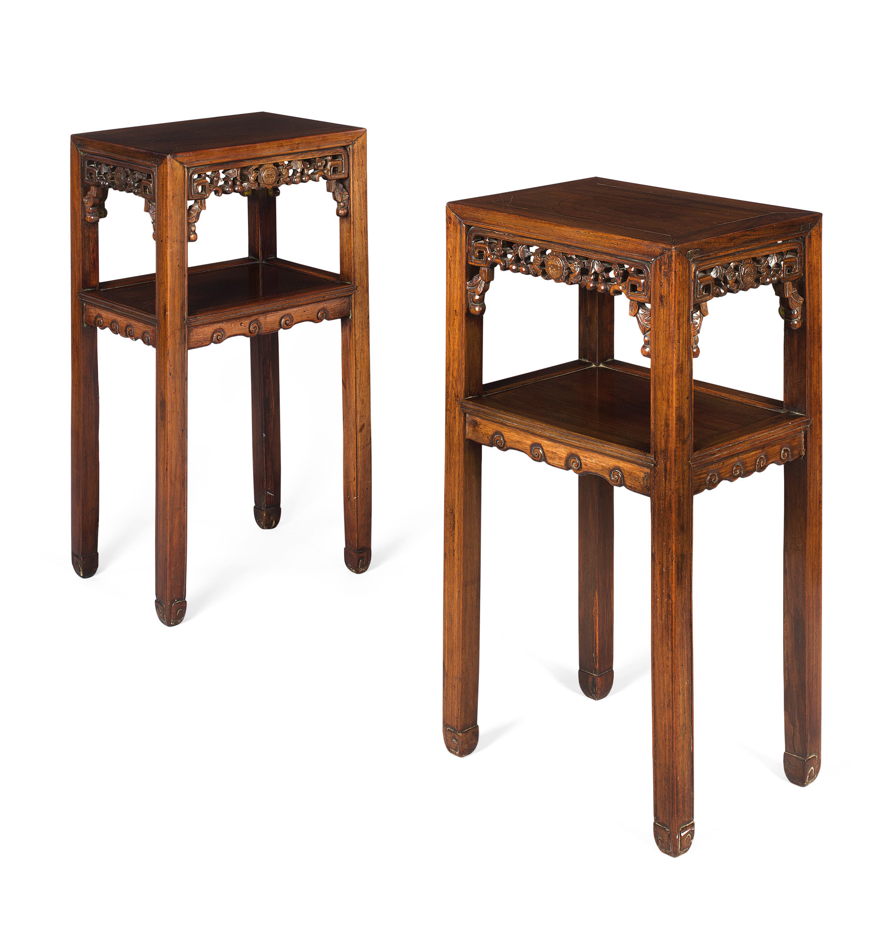 the cleated rectangular tops above a pierced frieze carved with fruiting vines and shou symbols, raised on square straight legs joined by an undertier and ending on scroll feet (2)