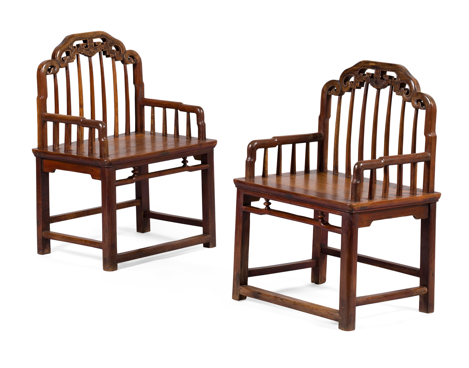 the arched top rails carved as ruyi heads with cloud scrolls and flower motifs, above spindled back and arms, above a cleated plank seat raised on straight legs joined by peripheral stretchers (2)