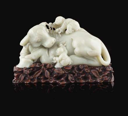 depicting a recumbent water buffalo turning its head back and to the left towards two laughing children, one riding on its back, the other crawling to its side, with an associated carved hardwood stand