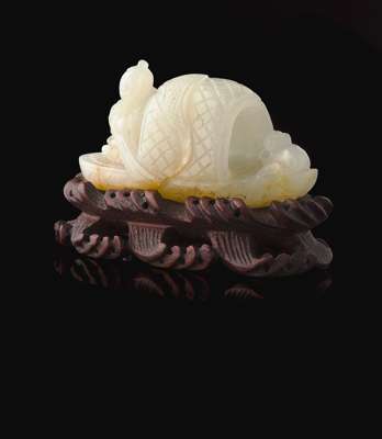 one standing figure paddling at the stern of the small vessel, another on the side, and a dog sitting at the bow, the fishing net thrown over the cabin, with carved hardwood stand