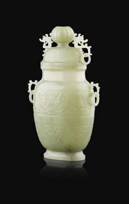 CELADON JADE ARCHAIC STYLE VASE AND COVER