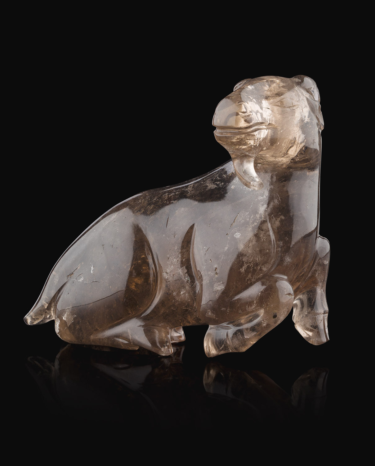 SMOKED QUARTZ FIGURE OF A RECUMBENT RAM