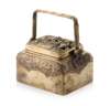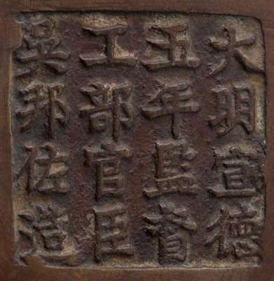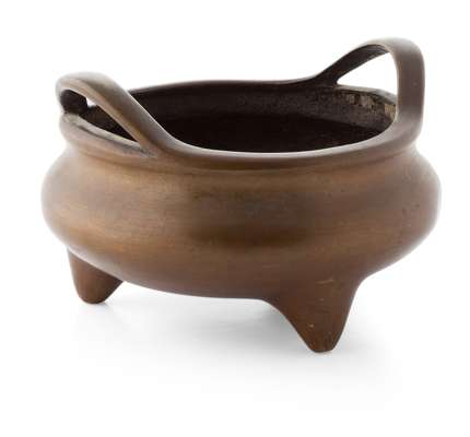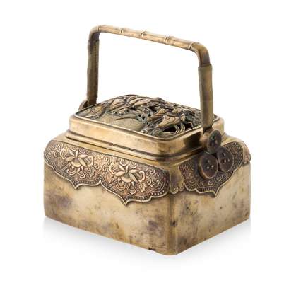 the pierced cover cast with immortals and pine trees, with a simulated bamboo handle and foliate cast sides, six character mark, 17cm wide; together with a BRONZE CENSER, late Qing Dynasty, 16cm diam (2)