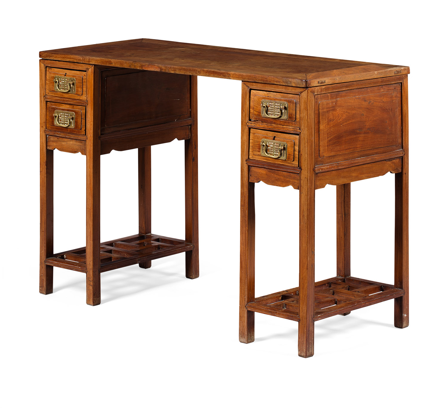 the rectangular cleated top raised on pedestal bases each with two short drawers and straight square legs with a lattice undertier