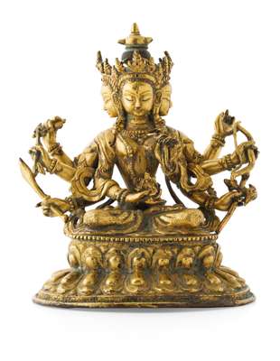 the four-headed deity seated in dhyanasana on a lotus base, the eight arms held in various mudras and supporting various attributes, the smiling faces with downcast eyes and surmounted by diadems