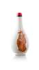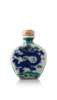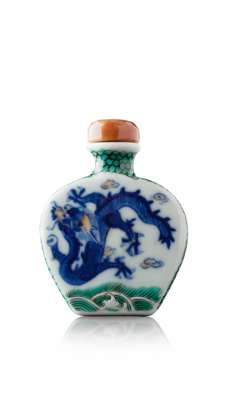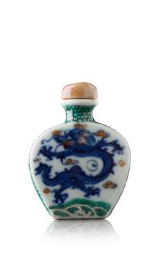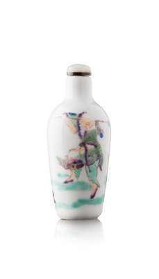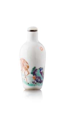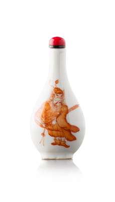 comprising: a flattened spade shape bottle decorated in underglaze blue and polychrome enamels, four-clawed dragons and the flaming pearl above waves, scale diaper on the shoulder, the base with four character Qianlong mark in underglaze blue, agate stopper; a pear shaped bottle decorated in iron red with Zhong Kuei in military attire and civilian attire on the reverse, dark red stopper and black collar; and a tapering cylinder form bottle in polychrome enamels with a man with basket accompanied by a deer in a landscape, quartz stopper (3)