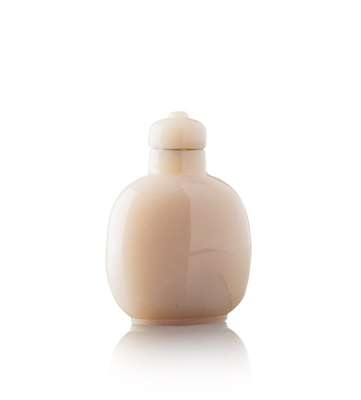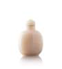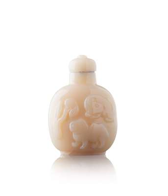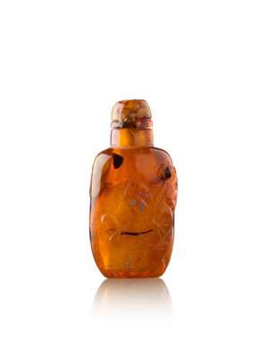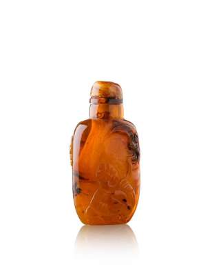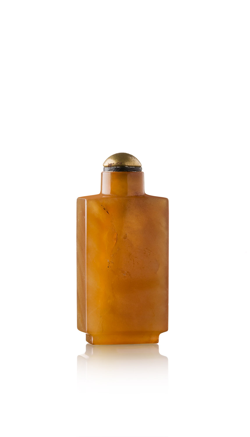 comprising: a clear amber bottle of rounded rectangular form with carved design of a man and bat, the other side with a man carrying a branch of lotus, hardstone stopper; and a dark mottled agate rectangular form bottle with brass stopper; and a miniature oyster white stone bottle with carved relief decoration of a camel and dog, matching stopper (3)