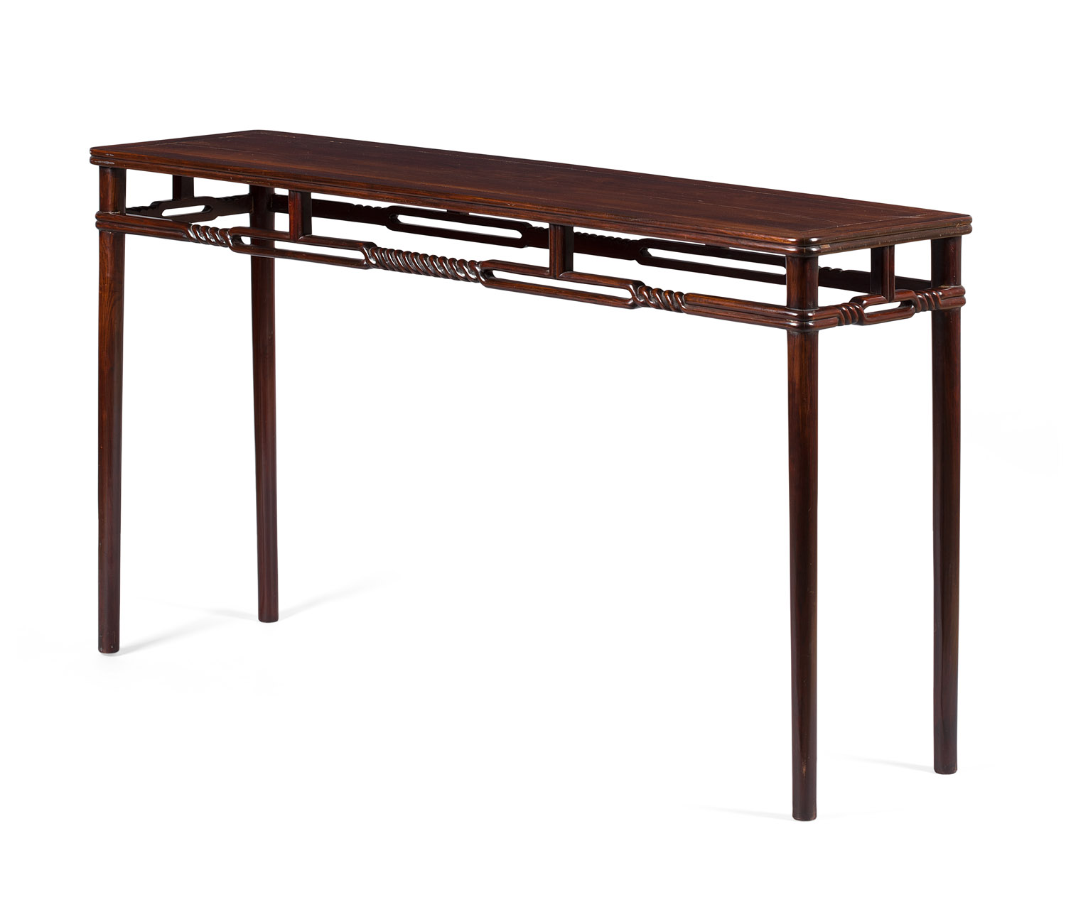 the long cleated top over an openwork apron with carved rope twist stretchers, raised on straight circular legs