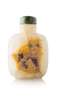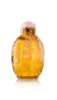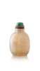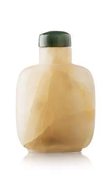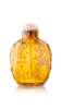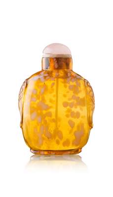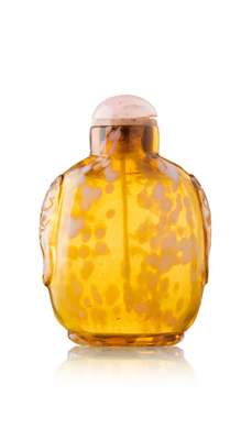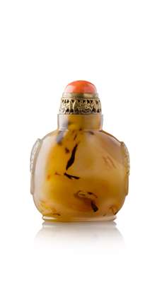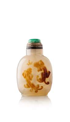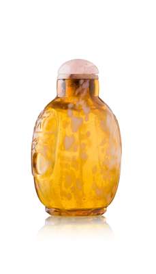 comprising a white veined chalcedony bottle of flattened oblong form, cameo carved to show two qilins chasing a ball, green stopper; an agate flattened oblong bottle of mushroom tone, carved through the skin to show a pair of qilong dragons chasing a bat, green stopper; an oval amber glass bottle with white inclusions, mask and ring handles, pink stopper; and an agate flattened round bottle with mask and ring handles with flecks of honey and brown, the stopper coral with brass collar (4)
