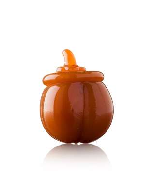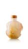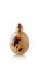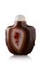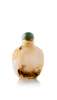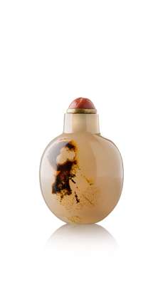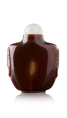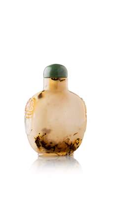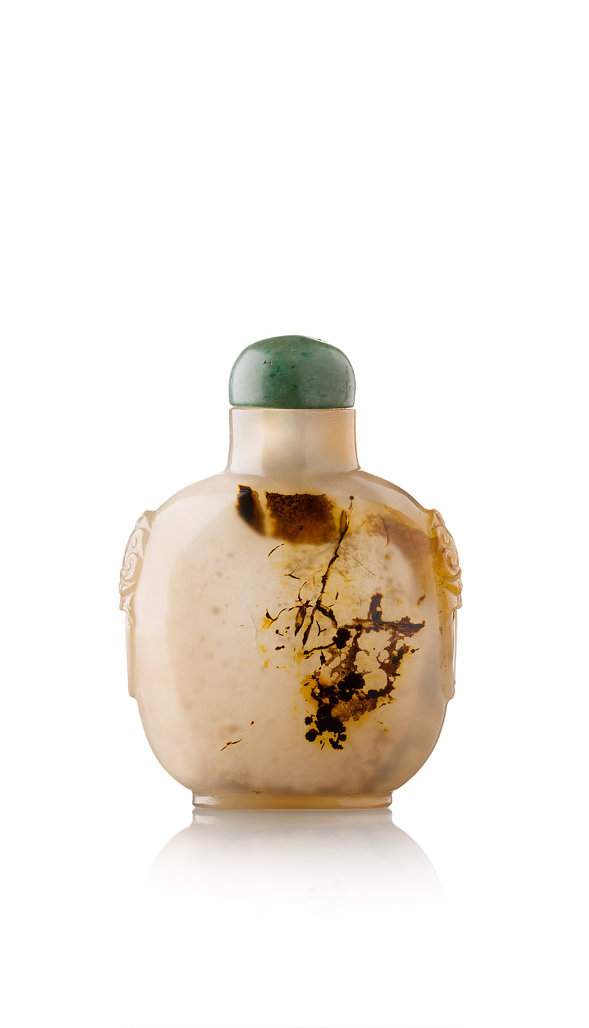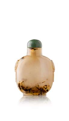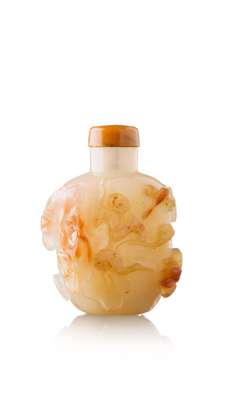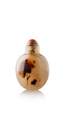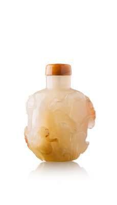 comprising: a 19th century honey agate flattened oblong bottle carved in high relief with cranes with dragonfly and lotus, rust coloured stopper; an agate rounded bottle with mask and ring handles and dark brown inclusions, green stopper; a flattened oval agate bottle with dark brown and black inclusions, coral red stopper; a spade-shaped agate bottle with white quartz centre framed by polychrome bands, mask and ring handles, pale green stopper; and a small amber glass gourd form bottle with matching stopper (5)