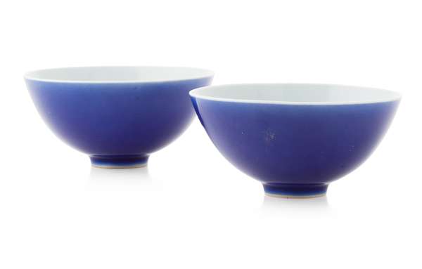 on a short foot with flared sides, covered in deep blue glaze thinning to the extremities, in a fitted box (2)