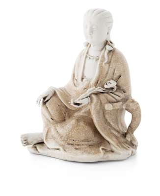 covered in a crackled glaze robe, seated with one leg across the other, one hand resting on her knee, the other holding a sceptre, the smiling face with downcast eyes, impressed mark