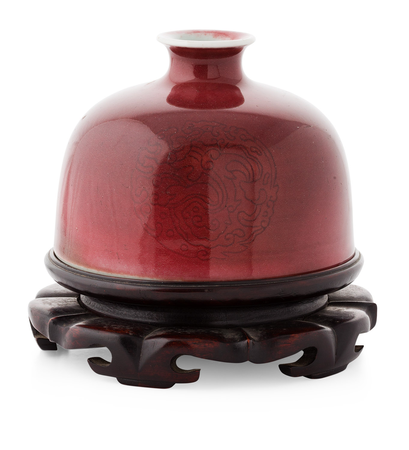 the domed sides with three incised medallions, with a rich pink glaze, Kangxi six character mark, with hardwood stand and box