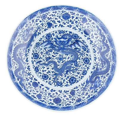 LARGE BLUE AND WHITE MING STYLE 'DRAGON' CHARGER