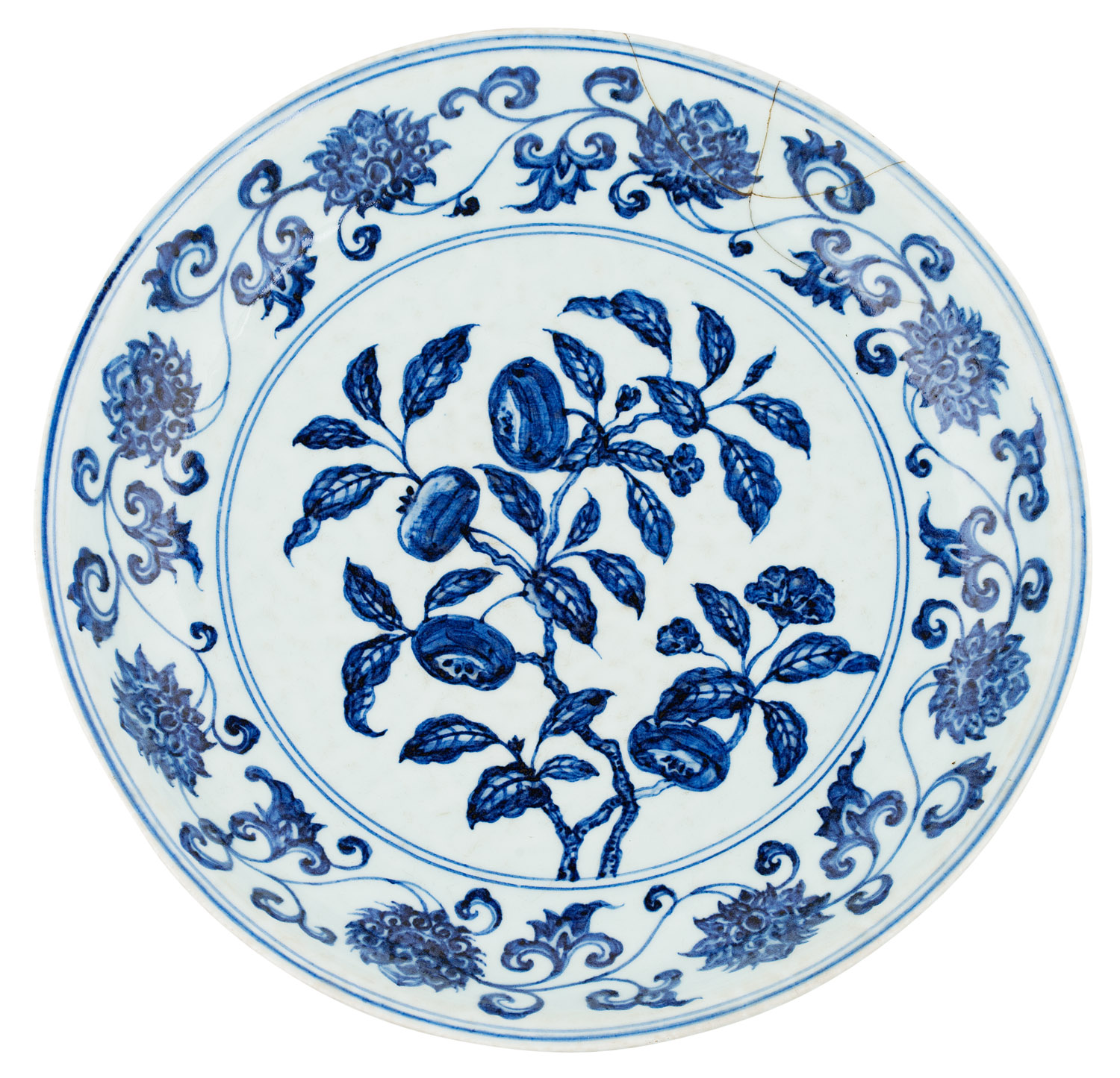 painted with pomegranates within a band of lotus blossom and scrolling stems, Xuande six character mark but later