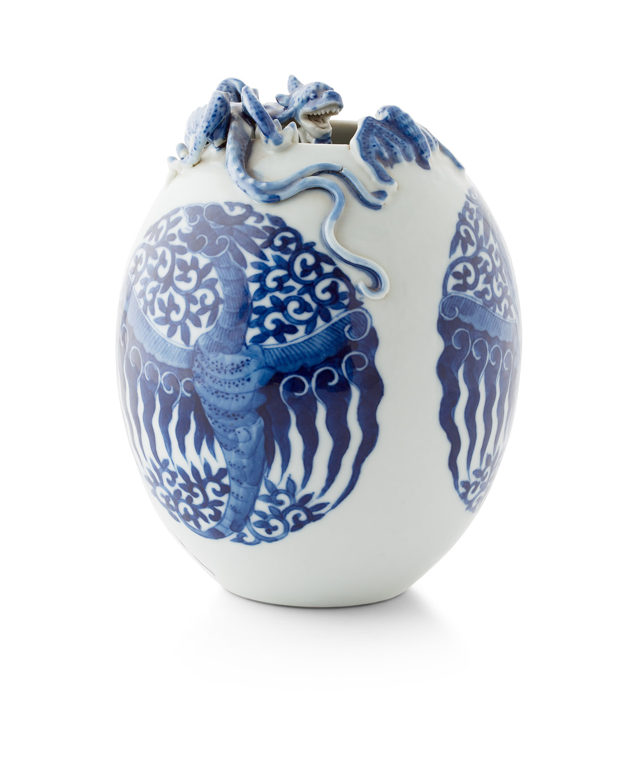 the oviform vase decorated with three phoenix medallions, the neck applied with a dragon and a bat, Yongzheng seal mark but later